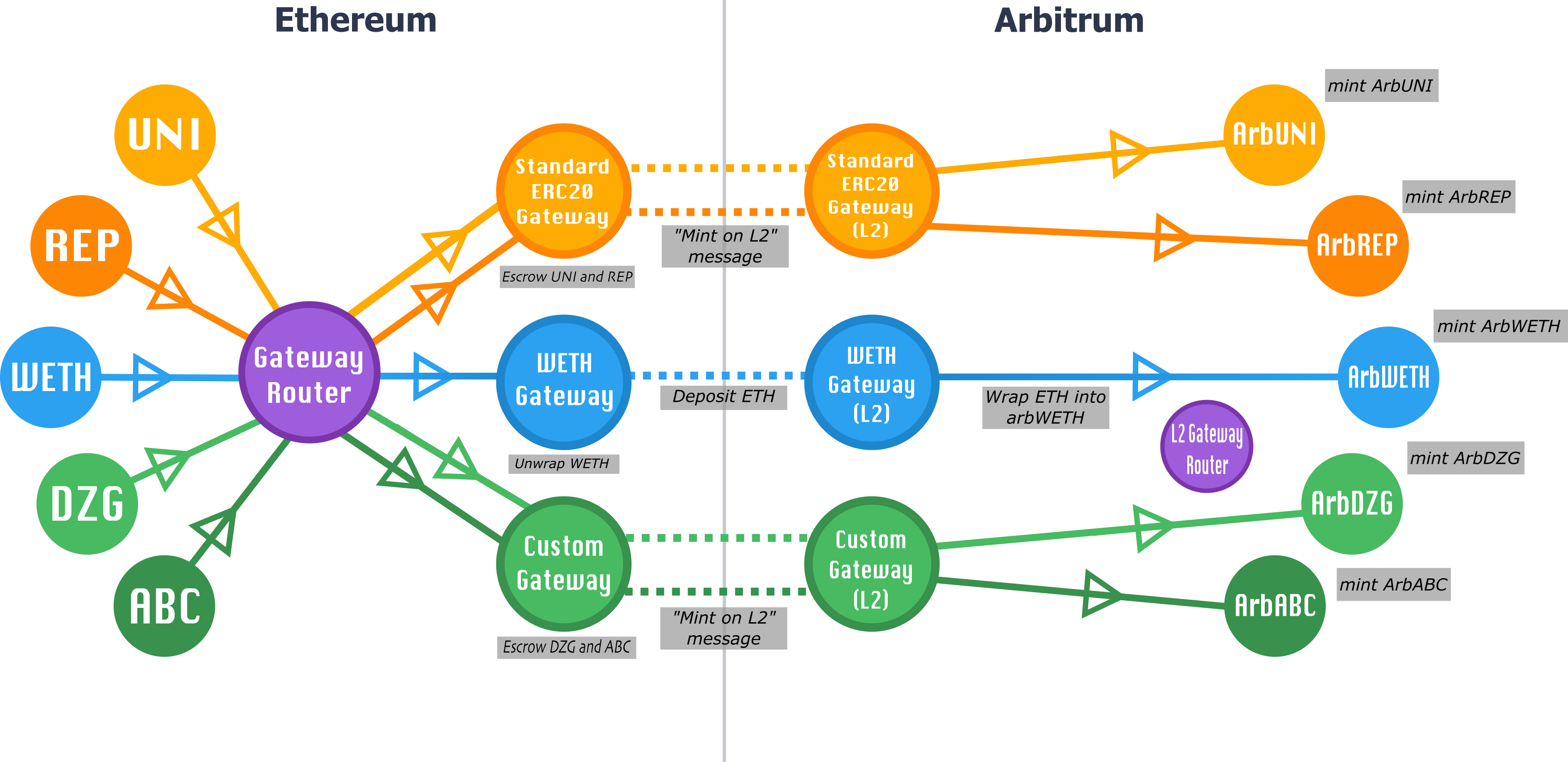 on the parent chain and its counterpart on Arbitrum. - Gateways: Pairs of contracts (one on the parent chain, one on the child chain) that implement a particular type of cross-chain asset bridging.